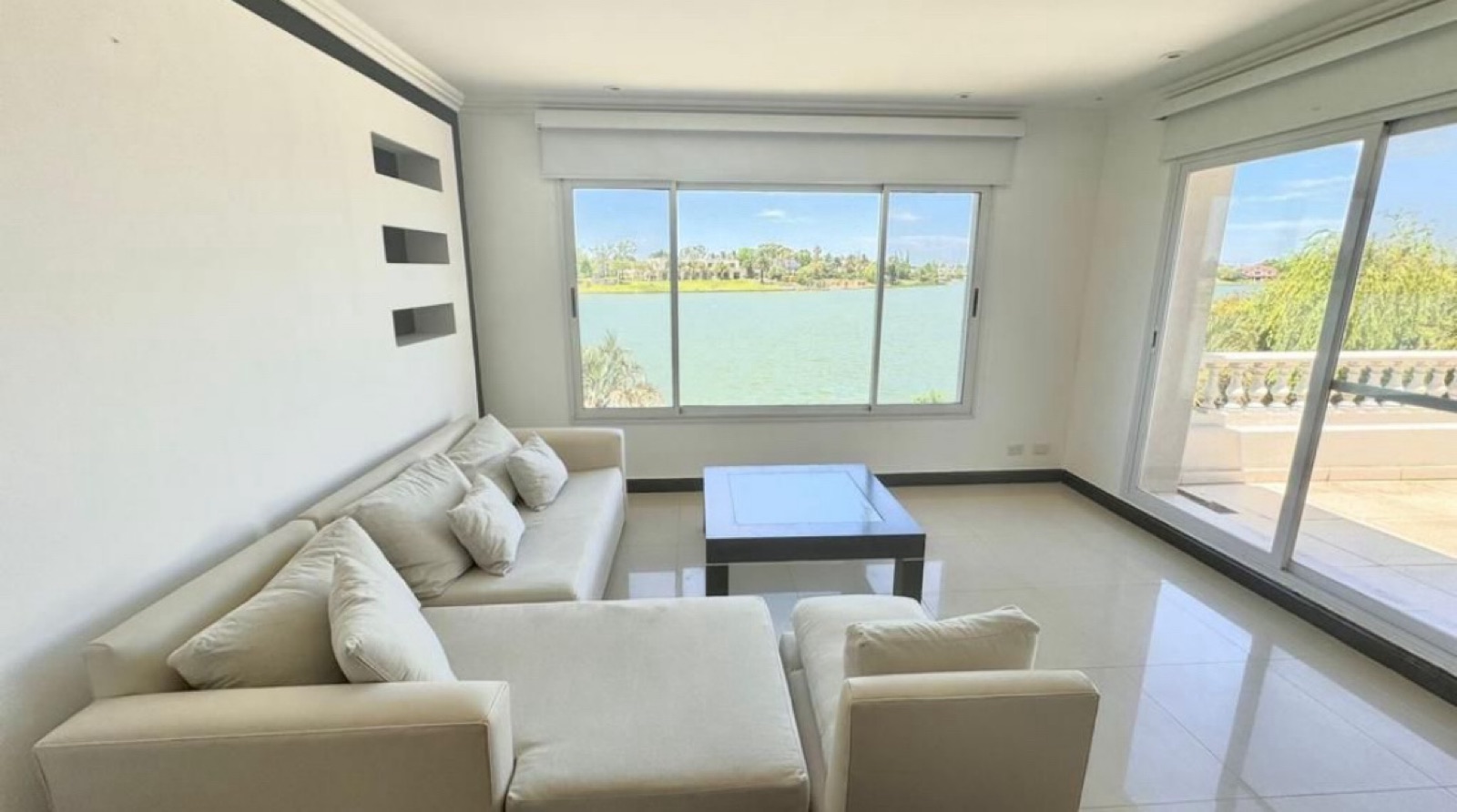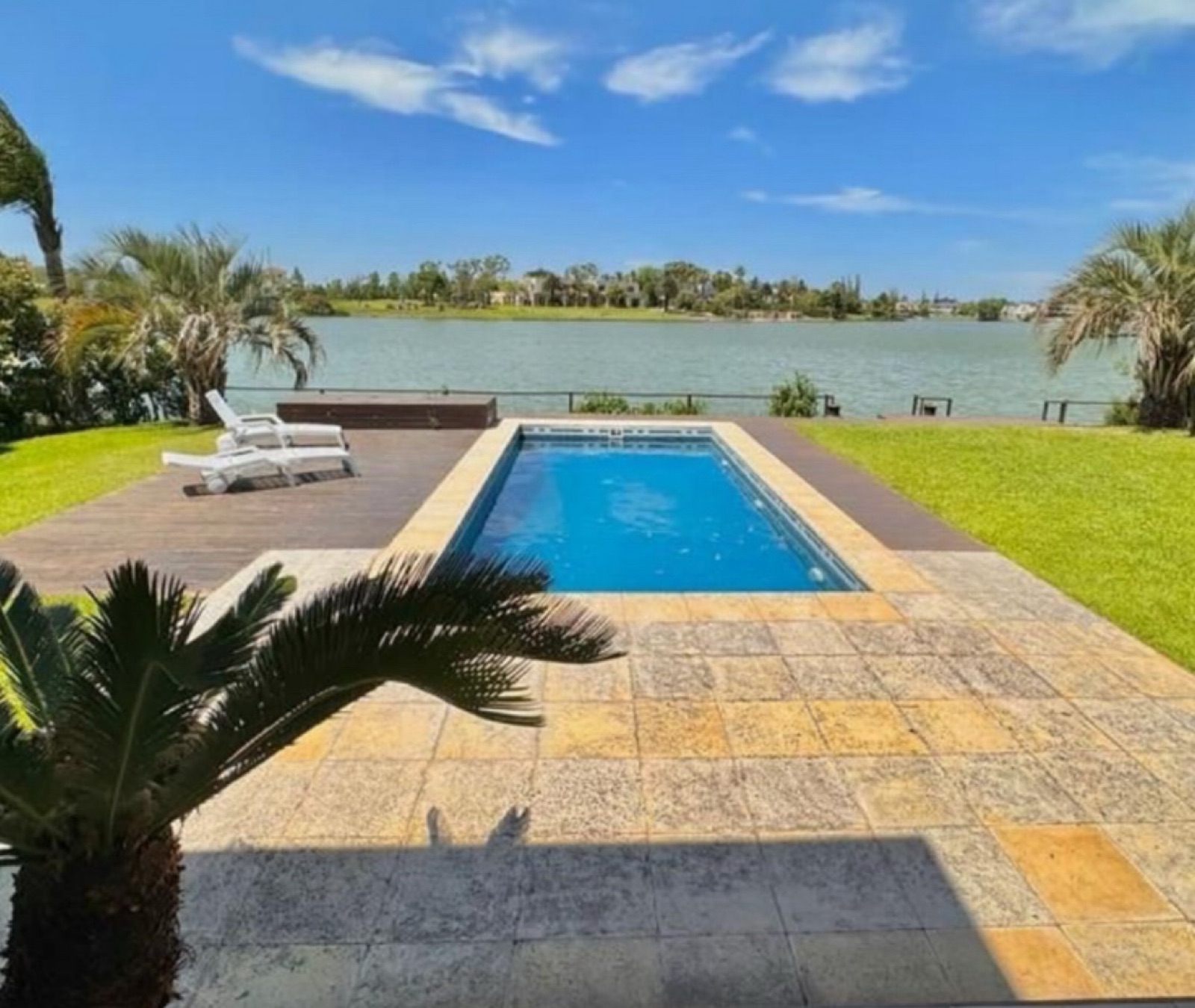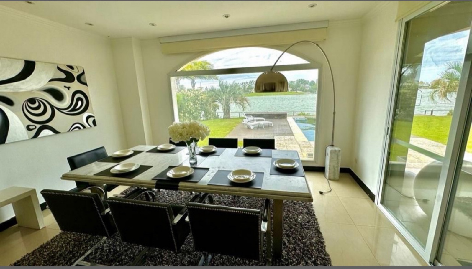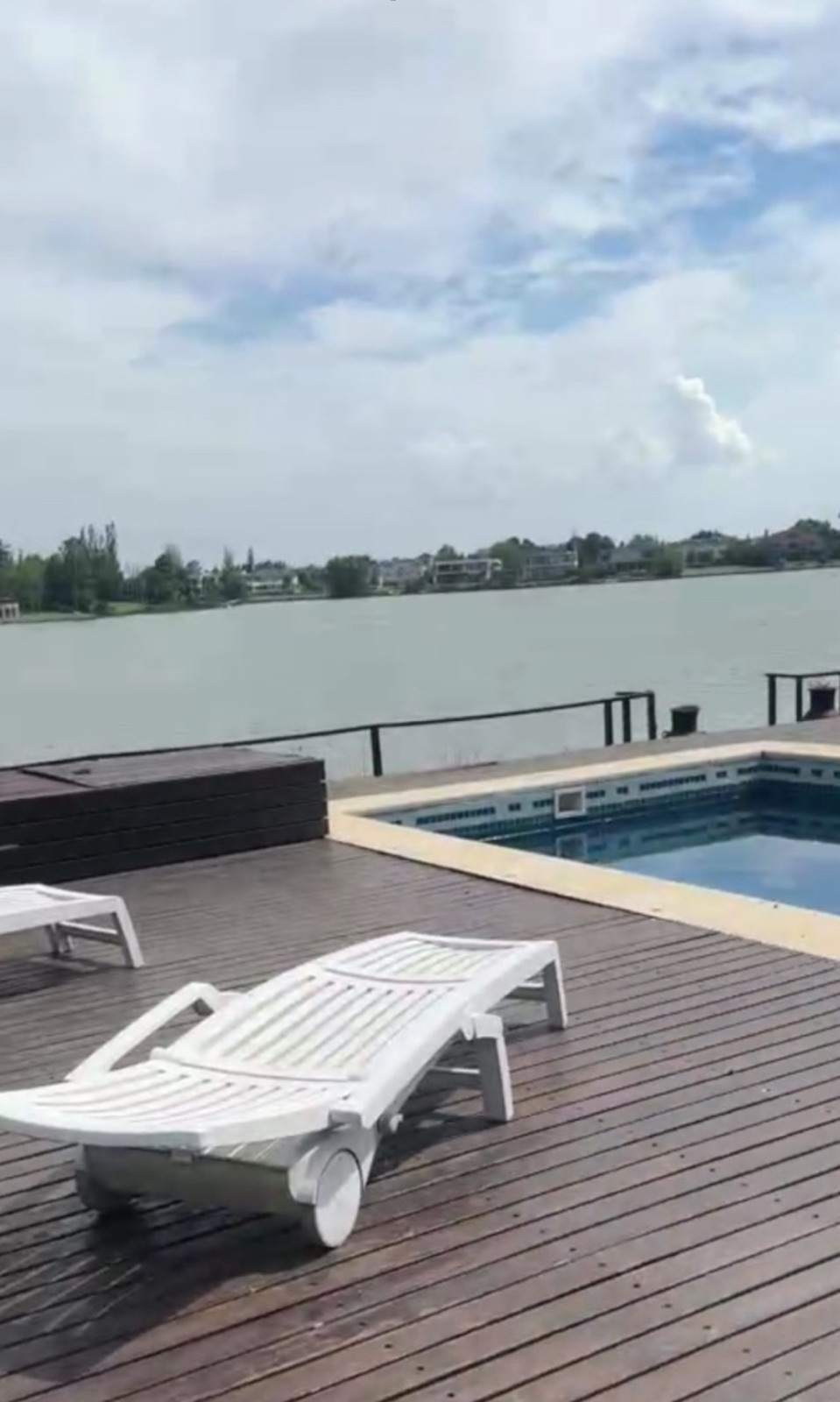 ingresando living y comedor, toil, escritorio o quinto dormitorio, cocina comedor diario, dep de servicio , sector de planchado, lavadero; en la primer planta 4 dormitorios con balcones aterrazados, 2 dorm en suite y 2 en semisuite; y en la segunda okanta un playroom; calefaccion central por losa ; aire acondicionados en todos los ambientes ; galeria , parrilla , piscina y muelle al lago !!! totalmnete parquizado exquisitamente, riego por aspersion , pasarella de madera que perimetra la costa al agua, bajada nautica . impecable estado consultanos en alquiler amoblado o sin amoblar !!!
