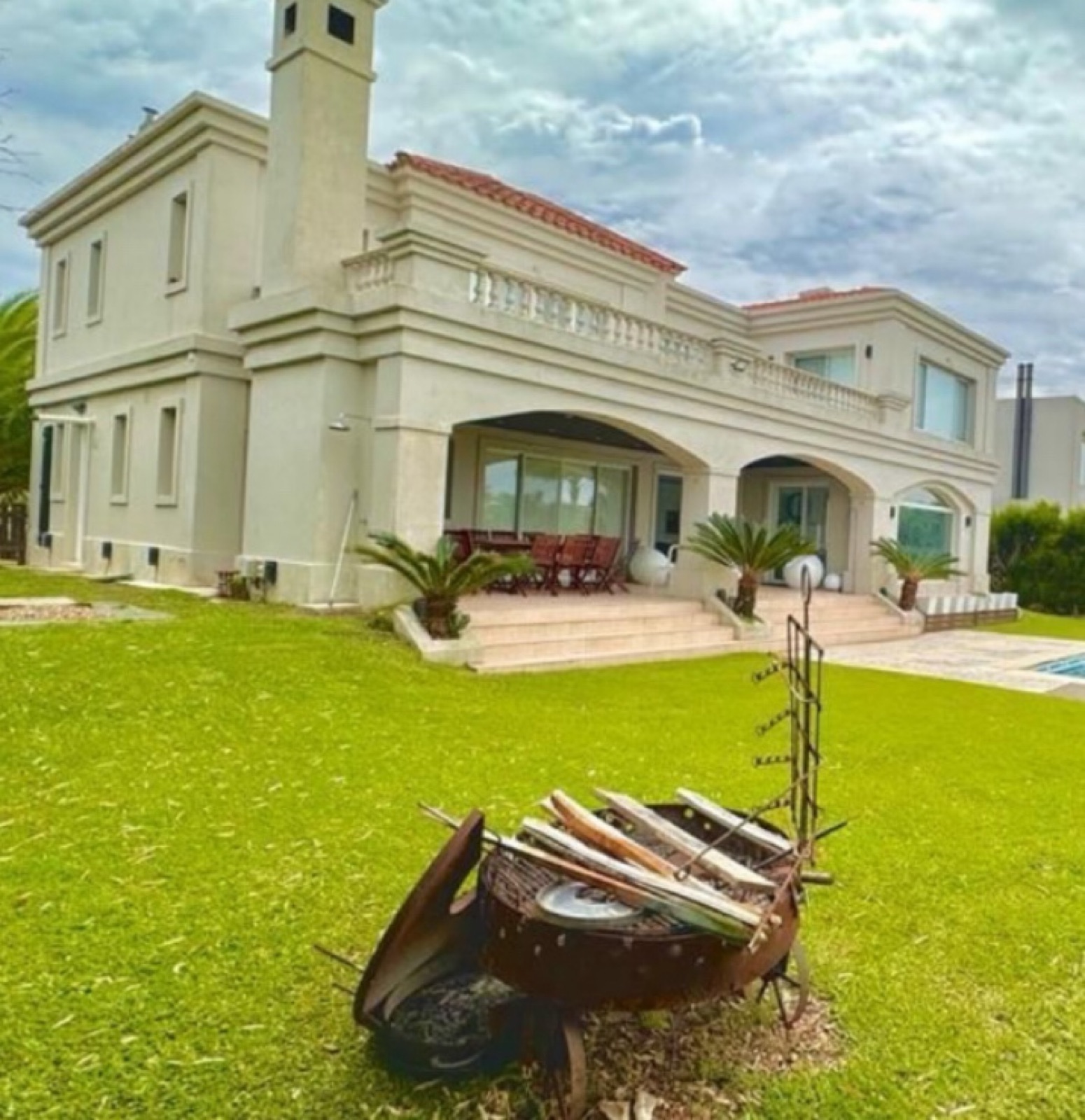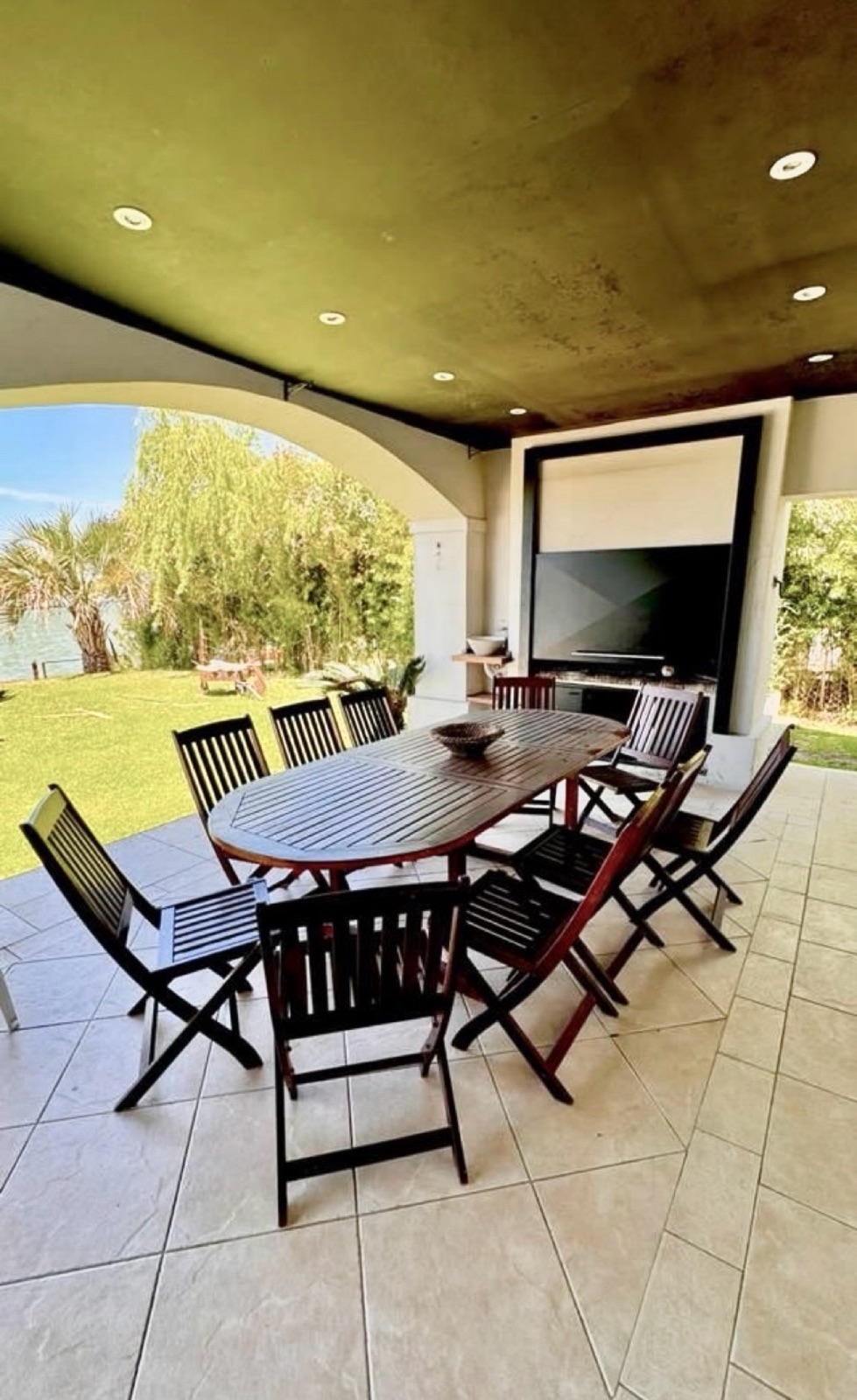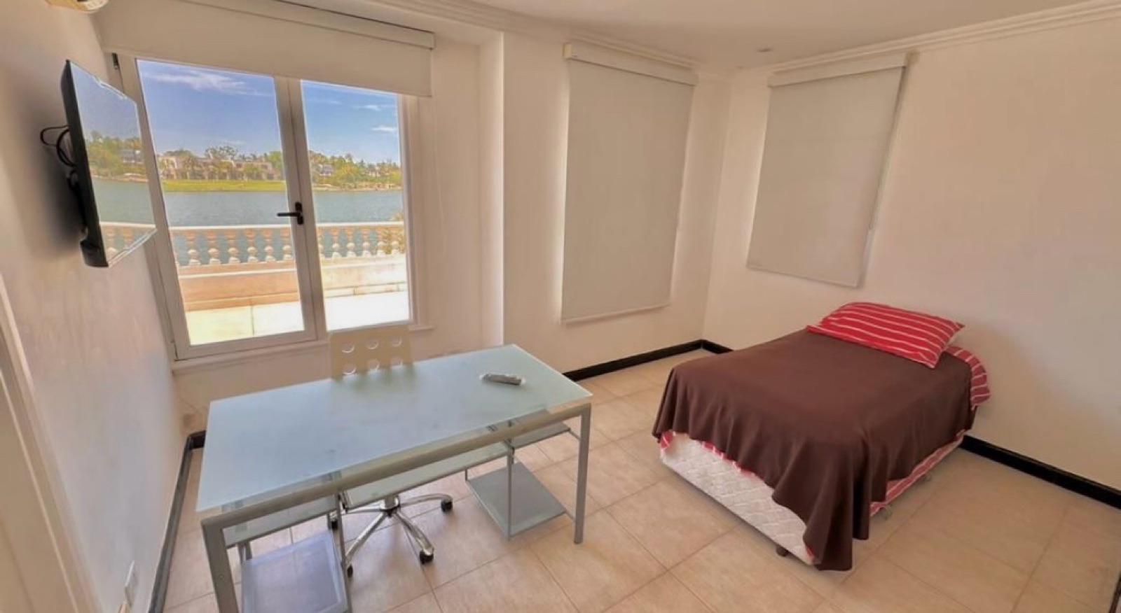 ingresando living y comedor, toil, escritorio o quinto dormitorio, cocina comedor diario, dep de servicio , sector de planchado, lavadero; en la primer planta 4 dormitorios con balcones aterrazados, 2 dorm en suite y 2 en semisuite; y en la segunda okanta un playroom; calefaccion central por losa ; aire acondicionados en todos los ambientes ; galeria , parrilla , piscina y muelle al lago !!! totalmnete parquizado exquisitamente, riego por aspersion , pasarella de madera que perimetra la costa al agua, bajada nautica . impecable estado consultanos en alquiler amoblado o sin amoblar !!!